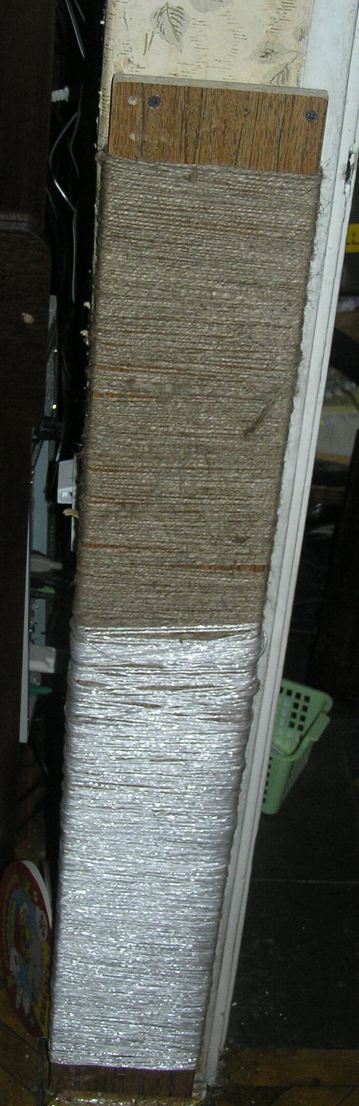 Поняв, что криками и наказаниями я все равно ничего не добьюсь, было принято решение сделать из любимых мест кота когтеточки. Мы нашли пару досточек, обмотали их самым обычным шпагатом и прикрепили к стене.
